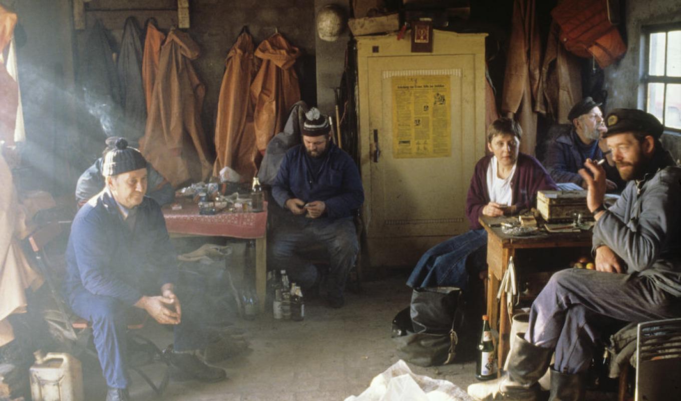 À première vue, on dirait presque un tableau de Vermeer, une scène à la fois calme et mélancolique. Cinq pêcheurs sont assis dans leur cabane en bois après leur journée de travail. Des bouteilles de bière traînent, des volutes de fumée flottent dans l’air. Et en plein milieu : Angela Merkel, 36 ans, écoute attentivement, un verre à liqueur à la main.