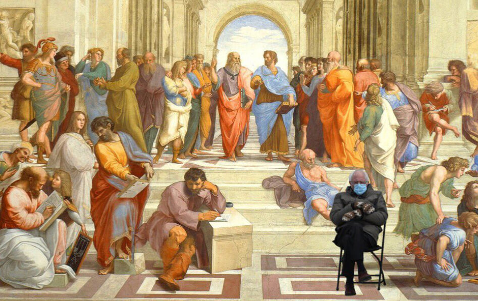 - Le terme de « meme » a été proposé pour la première fois par le biologiste et spécialiste de la théorie de l’évolution Richard Dawkins dans son ouvrage Le Gène égoïste (1976). Ce néologisme, créé à partir de « gène » et de « mimétisme », désigne un élément culturel reconnaissable, reproduit et transmis par l’imitation du comportement d’un individu. Dans le cas qui nous occupe, c’est l’impassibilité de Bernie Sanders face à la cérémonie d’investiture qui est reproduite à l’envi. La silhouette est découpée, puis insérée sur une image célèbre ou flanquée d’une légende humoristique : un « Bernie » renfrogné s’invite au baptême de Simba du Roi Lion, sur le trône de fer de Game of Thrones ou même entre Platon et Aristote dans L’École d’Athènes de Raphaël.