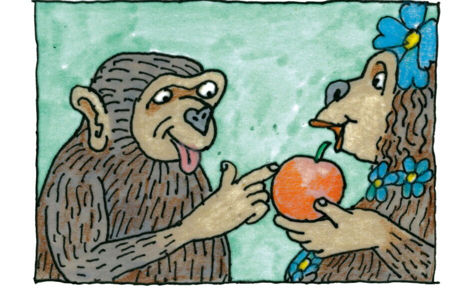 Au début de la Bible, dans la Genèse, il est écrit : « Dieu créa l’homme à son image. » Comme il avait un physique de primate, il créa un homme tout aussi simiesque que lui. Adam était donc, à l’origine, un singe, et Ève sa guenon. Leur progéniture et leur descendance évoluèrent ensuite, en perdant leurs poils et en développant leur intelligence, jusqu’à atteindre le stade de l’Homo sapiens actuel.