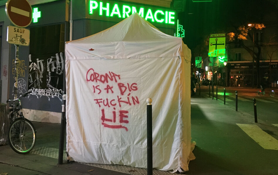 « Le corona est un putain d’énorme mensonge. » En allant acheter ma cinquantaine de masques à la pharmacie, dans le Xe arrondissement de Paris, mon regard a été saisi par cette inscription, taguée en lettres rouges (et en anglais !) sur une tente destinée à pratiquer des test anti-Covid. J’ai d’abord été amusée de la rencontre entre ce tag complotiste (n’ayons pas peur des mots) et l’enseigne clignotante de la pharmacie : l’indignation serait-elle un remède thérapeutique ? Puis je me suis demandé quel type de message la personne essayait de faire passer. Fallait-il le prendre au premier degré et m’interroger sincèrement sur la véracité de la pandémie ? Ou bien ce cri d’alarme était-il plutôt l’expression – maladroite, sinon risible – d’une colère venant de plus loin ?