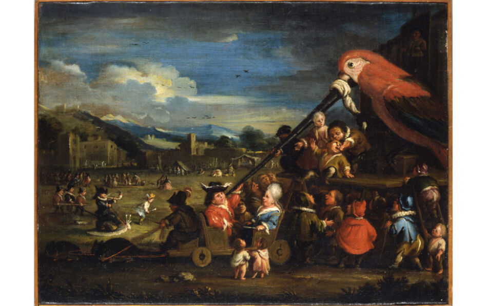- Un siècle plus tard, un autre peintre va se spécialiser dans les bambochades et faire glisser ce mot vers le sens festif que nous lui donnons aujourd’hui. Cet artiste se nomme Faustino Bocchi (1659-1742). Sa spécialité ? Représenter des « bambocci », nains ou gnomes, dans des postures grotesques. Influencé par Arcimboldo et par Jérôme Bosch, il a peut-être également eu sous les yeux des reproductions des nombreuses fresques antiques représentant des pygmées, qui faisaient les délices des citoyens romains. Ces pygmées de l’Antiquité sont souvent des « Égyptiens » s’ébattant dans les eaux du Nil. Ils constituent à ce titre un symbole de l’altérité envisagée comme repoussoir.