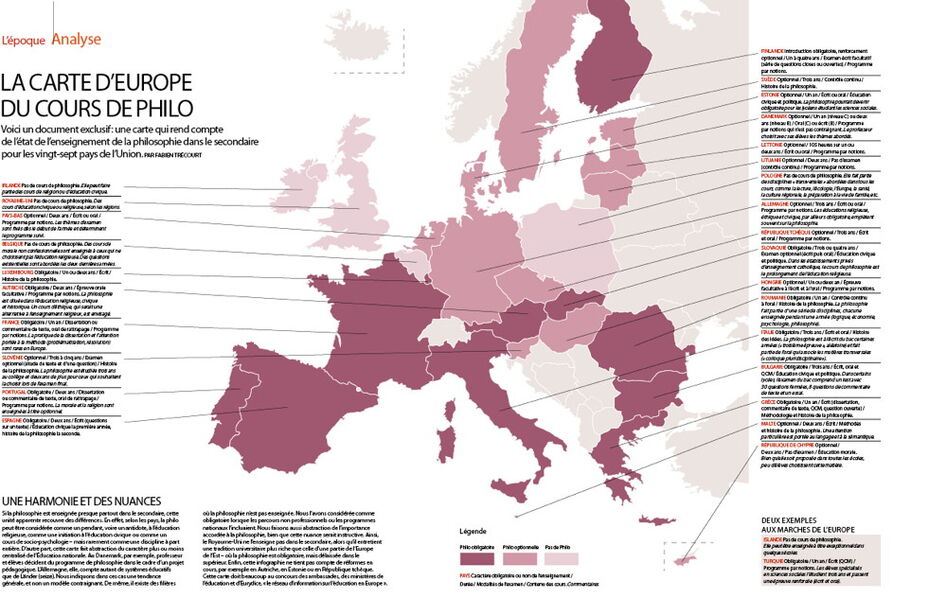 Si la philosophie est enseignée presque partout dans le secondaire, cette unité apparente recouvre des différences. En effet, selon les pays, la philo peut être considérée comme un pendant, voire un antidote, à l’éducation religieuse, comme une initiation à l’éducation civique ou comme un cours de socio-psychologie – mais rarement comme une discipline à part entière. D’autre part, cette carte fait abstraction du caractère plus ou moins centralisé de l’Éducation nationale. Au Danemark, par exemple, professeur et élèves décident du programme de philosophie dans le cadre d’un projet pédagogique. L’Allemagne, elle, compte autant de systèmes éducatifs que de Länder (seize). Nous indiquons dans ces cas une tendance générale, et non un modèle contraignant. De même, il existe des filières où la philosophie n’est pas enseignée. Nous l’avons considérée comme obligatoire lorsque les parcours non professionnels ou les programmes nationaux l’incluaient. Nous faisons aussi abstraction de l’importance accordée à la philosophie, bien que cette nuance serait instructive. Ainsi, le Royaume-Uni ne l’enseigne pas dans le secondaire, alors qu’il entretient une tradition universitaire plus riche que celle d’une partie de l’Europe de l’Est – où la philosophie est obligatoire, mais délaissée dans le supérieur. Enfin, cette infographie ne tient pas compte de réformes en cours, par exemple en Autriche, en Estonie ou en République tchèque.