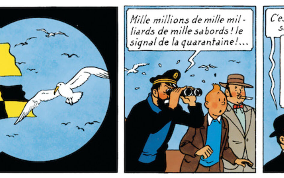 C’est sans doute parce qu’elle obéit à une logique de la séparation – séparation du pur et de l’impur, de l’ami et de l’ennemi, de la vie et de la mort – que Haddock et Tintin se trouvent confrontés à la quarantaine dans Le Temple du Soleil. Pour rappel, leur ami le professeur Tournesol, qui s’est emparé du bracelet de la momie de l’Inca Rascar Capac, a été enlevé et emmené à Callao au Pérou à bord d’un navire, Le Pachacamac. Alors que Tintin et le capitaine s’apprêtent à monter à bord avec la police locale, deux pavillons, jaune et noir, Québec et Lima dans le code international des signaux maritimes, sont hissés. « Deux cas de peste bubonique à bord ! J’ai ordonné trois semaines de quarantaine », explique le médecin du port. Tandis que Dupond et Dupont, dépêchés sur place, demandent si la « quarantaine » est le nom donné à la fête d’anniversaire du commandant du bateau, Haddock ne s’y trompe pas… Mais Tintin, lui, décide de monter à bord la nuit même pour en avoir le cœur net. À la lumière de l’expérience du Covid-19, son action pose question. Certes, il soupçonne à juste titre que le médecin du port, un Indien quechua, est complice de ceux qui ont enlevé le professeur pour venger le sacrilège de la momie. Mais il n’empêche… notre héros ne respecte pas l’interdit. Dans ses aventures, le courage de Tintin n’est pas le courage héroïque de celui qui cherche l’immortalité en mettant en jeu sa vie face à l’ennemi, c’est plutôt le courage socratique de celui qui dispose « de la science de ce qu’il faut craindre et de ce qu’il faut oser » (Lachès). En l’occurrence, si Tintin n’a pas peur et ose braver l’interdit de la quarantaine, c’est parce qu’il est convaincu que c’est un mensonge… et qu’il veut sauver une vie en danger. Sa désobéissance s’autorise d’un savoir – plutôt d’un soupçon, en réalité – mais surtout elle procède d’un souci éthique. Il va au-devant d’une contamination personnelle pour éviter la mort imminente d’un autre que lui. C’est le courage socratique que partagent aujourd’hui tous les soignants du Covid-19.