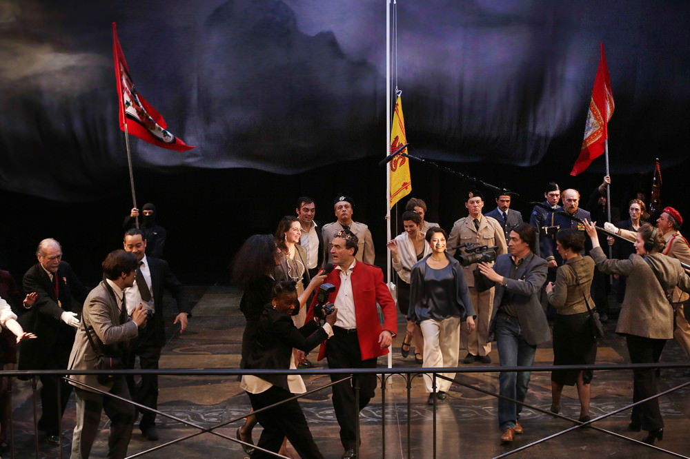 La décision d'Ariane Mnouchkine, devenue aujourd'hui monnaie courante, de situer l'intrigue dans l'époque contemporaine est ici parfaitement justifiée, dans la mesure où l'insistance sur le rôle des médias, à travers la nuée de journalistes qui accompagnent les personnages, permet de renouveler notre vision des époux Macbeth. Leur espoir de se soustraire aux remords des criminels n'a de sens, en effet, que s'ils confondent la conscience qu'ils ont d'eux-mêmes avec le regard d'un public complaisant.