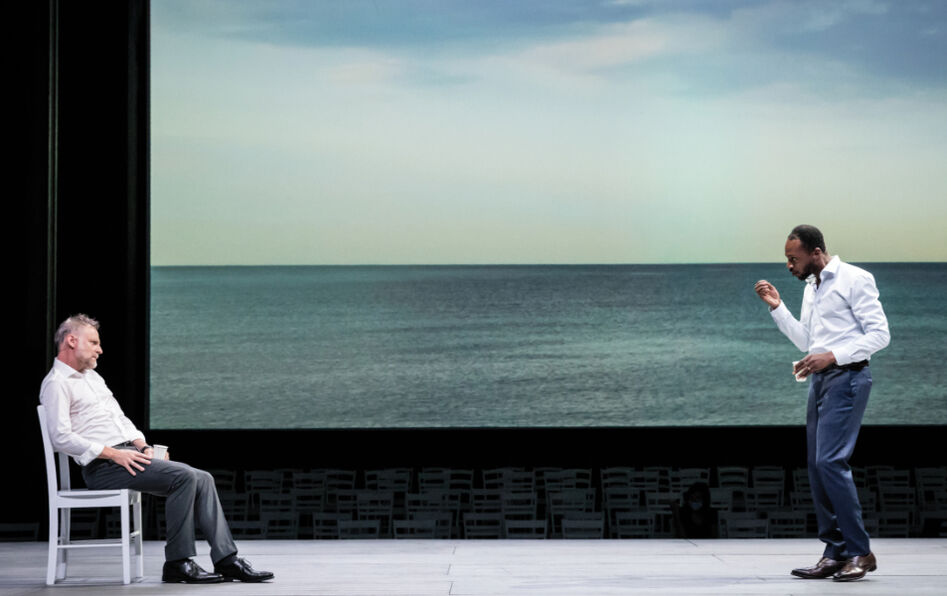 Racine par temps de crise, voici une idée du metteur en scène Stéphane Braunschweig dont la réussite tient à son actualisation sans artifice. Le directeur de l’Odéon-Théâtre de l’Europe dit avoir pensé à Iphigénie en voyant le « monde mis à l’arrêt » et les rues « figées dans un silence irréel », notre pouvoir rendu subitement impuissant par la force des aléas. Comme le roi Agamemnon dans ce drame inspiré d’Eschyle, nous voici confrontés à la difficulté d’agir librement lorsque tout nous échappe. En exigeant un sacrifice pour permettre le retour des vents et le départ des navires de guerre vers Troie, le devin Calchas met en effet le roi des Grecs face à un choix impossible : faire mourir sa fille Iphigénie ou cesser toute conquête. Accepter le sacrifice ou la paralysie. Le cœur de la tragédie repose ainsi sur des « faits qui excitent la terreur et la pitié », surtout lorsqu’ils « arrivent contre toute attente, et mieux encore lorsqu’ils sont amenés les uns par les autres », comme l’écrit Aristote. La troupe dirigée par Stéphane Braunschweig donne corps à cette fatalité édifiante – dans un décor limité à une scène surélevée tirée entre des rangées de chaises, disposées de part et d’autre, face à deux grands écrans reproduisant une mer d’huile. Imaginé durant le confinement, capable de répondre aux contraintes sanitaires, ce spectacle « covido-compatible » est interprété en alternance par deux équipes. Il s’agit non seulement de garantir un roulement mais aussi d’employer le plus grand nombre de comédiens dans une période économiquement difficile. Ce soir-là, Suzanne Aubert dans le rôle puissant d’Iphigénie et Claude Duparfait (photo, à gauche) dans celui tiraillé d’Agamemnon se distinguaient aux côtés d’Anne Cantineau en Clytemnestre, mère et épouse accablée, lançant ce cri magnifique : « Mourrai-je tant de fois sans sortir de la vie ? » Cette question s’offre à nous dans sa puissance intacte : à quels sacrifices sommes-nous prêts ? À la différence de la tragédie, notre choix n’est cependant suspendu à aucune fatalité : nous avons heureusement troqué la résignation fatidique pour les choix politiques.