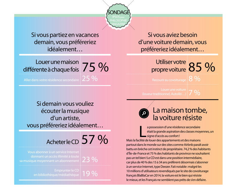 « Jadis, ils avaient eu au moins la frénésie d’avoir. Cette exigence, souvent, leur avait tenu lieu d’existence. » De cette passion consumériste pour Les Choses, que décrit Georges Perec en 1965, sommes-nous revenus ? Force est de constater que beaucoup de ces objets et de ces biens qui saturent nos existences prennent aujourd’hui de moins en moins de place, physique et symbolique… jusqu’à changer notre rapport au monde et à notre identité ? Voyons : à la bibliothèque étendue sur des dizaines de rayons alourdis de centaines d’opus, d’Aristote à Zola, se disputent désormais les quelques grammes de la liseuse et ses milliers de livres. À la collection de CD, l’abonnement à Deezer ou à Spotify, qui promet pour quelques euros un accès illimité à toute la musique du monde. Au vélo qui rouille et dont on craint le vol, le Vélib’, le Vélo’v ou le Villo!, auxquels on s’abonne dans les grandes villes. Quant à la voiture, remisée au garage, elle n’est plus exactement ce symbole de liberté, d’autonomie et de puissance, glorifié durant les Trente Glorieuses. « Les jeunes générations passent globalement moins le permis de conduire et elles ne l’associent plus au fait de posséder sa propre voiture, ce qui n’était pas le cas pour les 30-60 ans il y a seulement dix ans, confirme la sociologue spécialiste de la mobilité Stéphanie Vincent-Geslin. La responsabilité d’une voiture, de son stationnement et de son entretien, est devenue une charge trop lourde, que concurrencent largement les systèmes d’autopartage et de covoiturage. On assiste à un découplage entre l’usage et la possession. » Un phénomène attribuable non seulement à la conjonction de la crise économique et d’un souci écologique croissant, mais aussi à l’émergence de l’économie du partage. Elle porte avec elle l’idée que posséder un bien ne signifie plus nécessairement jouir de son appropriation individuelle. L’essor du site Drivy, leader en France de la location de voitures entre particuliers, repose sur ce principe : mettre en contact des usagers ayant un besoin de voiture épisodique et des propriétaires, dont le véhicule reste trop souvent au garage. Les uns profitent d’un service plus personnel et moins coûteux, tandis que les autres couvrent ainsi l’entretien de leur voiture. Paulin Dementhon, le concepteur du site, précise : « On n’a pas changé les cultures en cinq ou dix ans, tout au plus les habitudes en faisant passer certains automobilistes de la propriété à l’usage. En fait, on constate un détachement par rapport à l’objet voiture mais pas par rapport à sa fonction, à la liberté qu’elle apporte. En revanche, cette liberté n’est plus liée à la propriété. »